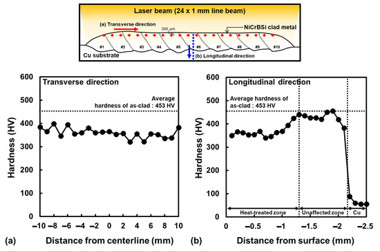 Hardness distribution in the (a) transverse and (b) longitudinal directions for an as-clad specimen.