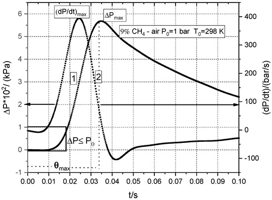A typical diagram p (t) recorded during the explosion of a 9% methane–air mixture at the initial temperature of T0 = 298 K and initial pressure P0 = 1 bar (100 kPa) is shown in Figure 2 together with its derivative. The derivation of the p (t) curve was performed after a prior smoothing using the Savitzky–Golay method. This involves the analysis of 500–700 points in the range 0 ≤ t ≤ ɵmax. In all cases, a smoothing level of 5% was used, as a smoothing performed at a higher level (for example, 20%) leads to both noise reduction and signal distortion.