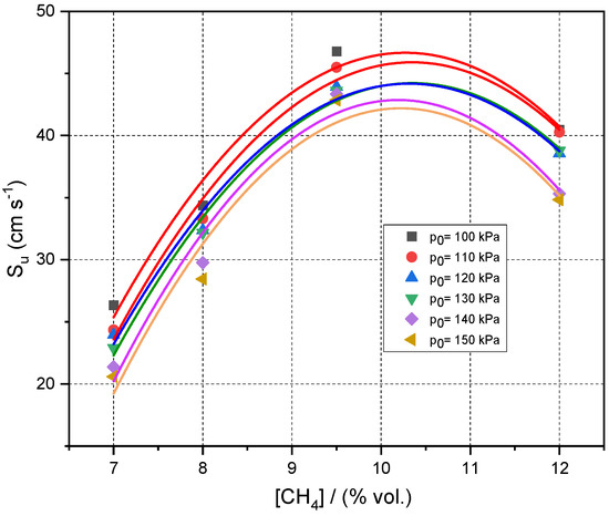 The normal burning velocities of methane–air at various initial pressures and ambient initial temperature are plotted against methane concentration in Figure 4 along with the best-fit correlations of data as second–order polynomials. The smoothed peak burning velocity at 1 bar is Su = 46 cm s−1, which is well within the range of values reported from the literature (41 cms−1) [20]. The initial pressure increase generates a decrease in normal burning velocities for all examined mixtures.