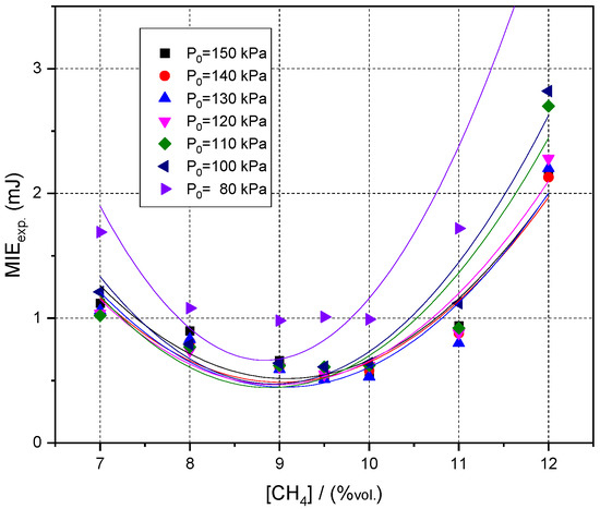In Figure 6, the variation of the minimum ignition energy with the initial pressure and methane concentration is also observed, the highest values obtained being for the sub-atmospheric pressure, 80 kPa, and the lowest values being obtained for the initial pressure of 150 kPa. The minimum value obtained using the experimental setup described, respectively, by initiation with high voltage capacitive electrical sparks, is in good agreement with the data reported in the literature, although the minimum value is double that reported by Lewis and von Elbe [49].