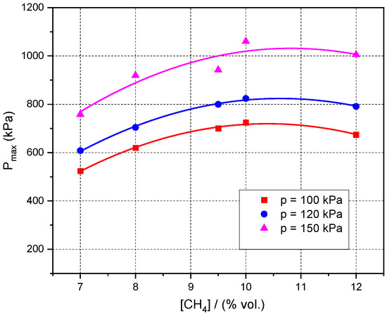 The variation of maximum rates of pressure rises against methane composition at various initial pressures is shown in Figure 10 and Figure 11, where data obtained in normal conditions and in the presence of a radioactive source were plotted. The rates of pressure rise increase with the increasing initial pressure at all methane concentrations. In both cases and at each examined pressure, the maximum rates of pressure rise reach a peak for CH4–air mixtures at the same concentration range where highest peak pressures were measured, namely stoichiometric and as it is called the most reactive concentration, approx. 10%.