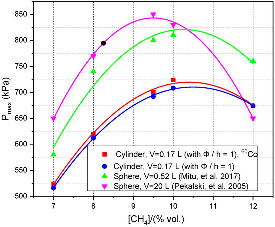 A comparison of peak explosion pressures obtained in normal conditions and in the presence of radioactive sources can be seen in Figure 9, where little data from literature were also plotted. A more comprehensive comparison of our results with reference data from literature can be found in Table 5.