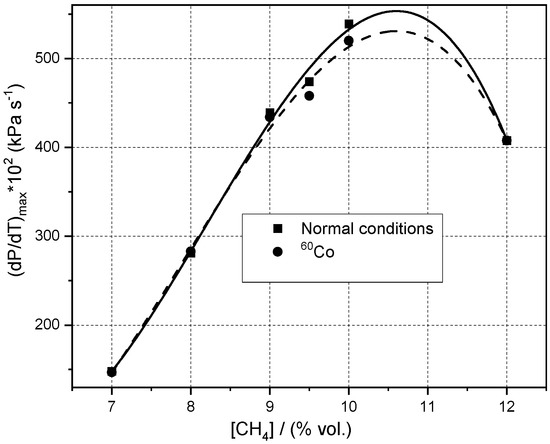 Experimental maximum rate of pressure rises for CH4–air mixtures at ambient initial conditions and in the presence of 60Co.