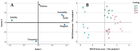 The factor analysis shows in Figure 1. Figure 1A shows that factor 1 is composed of permeability, tension, and elongation with a higher percentage than 84%, while factor 2 is composed of the thickness variable with a higher percentage than 90%. According to the estimated factors, the dispersion graph (Figure 1B) shows that the R4 coating presents the best conditions in relation to factor 1.