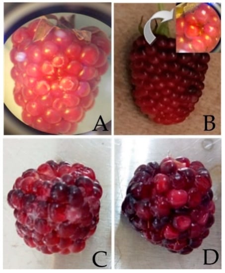 Blackberries appearance. (A,B) Coated and uncoated fruits on day 1. (C,D) Coated and uncoated fruits on day 19.