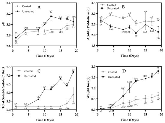 Monitoring the physicochemical properties of coated and uncoated fruits. (A) pH (B) Acidity (C) Total Soluble Solids (D) Weight loss. The averages with a common letter are not significantly different according to the Tukey test (p ≥ 0.05). Uppercase letters differences between days and lowercase letters differences between material coated and uncoated fruits.