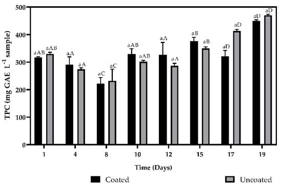 The results obtained for the total phenol contents evaluated by the Folin–Ciocalteu method are presented in Figure 4. According to the analysis of variance, significant differences were found between for the fruits on the different days evaluated (p < 0.05), that is, the fruits coated and uncoated presented a higher content of total phenols on day 19 (450.00 ± 3.9 and 470.00 ± 3.93 mg GAE L−1 sample) compared to day one (316.2.75 ± and 329.44 ± 6.28 mg GAE L−1 sample), which was confirmed by Tukey′s test.