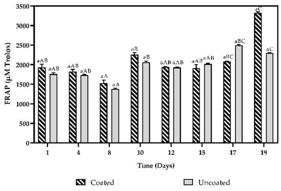 Regarding the antioxidant activity by the FRAP method (Figure 6), significant differences were only observed between the evaluated storage days (p < 0.05), both coated and uncoated fruits present a higher activity on day 19 compared to day 1.