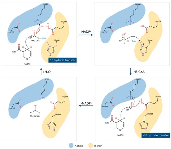 There are two classes of HMGRs, Class I (eukaryotes) and Class II (prokaryotes). The Class I HMGRs are mainly membrane-bound and consist of transmembrane and a catalytic domain carboxyl-terminal and an amino-terminal membrane anchor domain, whereas the Class II HMGR enzymes are all cytosolic and lack the membrane anchor domain [,]. Due to dissimilarities between the two classes, the existence of significant differences in the reaction mechanism is possible. The reaction mechanism of this enzyme has been studied both by computational models and experimentally.