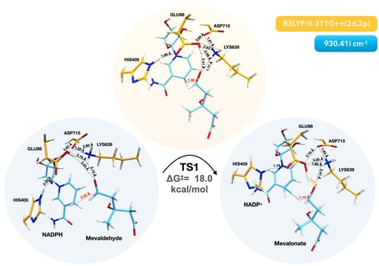 In more detail, in both reactants and the transition state structure, Glu98 and mevaldehyde are 3.20 Å and 2.41 Å apart, whereas the newly formed bond between Glu98-H and O-mevaldehyde is 1.01 Å. In addition, Glu98 stays close to His405, with the distance ranging from 2.03 Å in the reactants to 1.79 Å in the products, whereas the distance between Glu98 and Lys639 changes from 2.70 to 1.80 Å. Moreover, Glu98 is quite far from the negatively charged Asp715, and the distance does not change greatly in both reactants and products, 3.82 Å and 3.78 Å, respectively. In contrast, Lys639 is cationic and thus stays extremely close to the anionic Asp715 during the entire reaction with distances of 1.53 Å and 1.63 Å, respectively. Mevaldehyde is relatively close to the Lys639, with distances of 2.13 Å and 2.41 Å in reactants and products. Interestingly, we observed Glu559/Glu98 as a proton donor and not Lys691/Lys639 as in the previous study by Oliveira et al. [] The Lys691/Lys639 as a proton donor was explained through the difference in the class of reductase [], but it can be further explained in the absence of strong interaction and hydrogen bond between His405 and Glu98 as we chose the protonation state of the His405, which would maintain this interaction throughout the simulation.