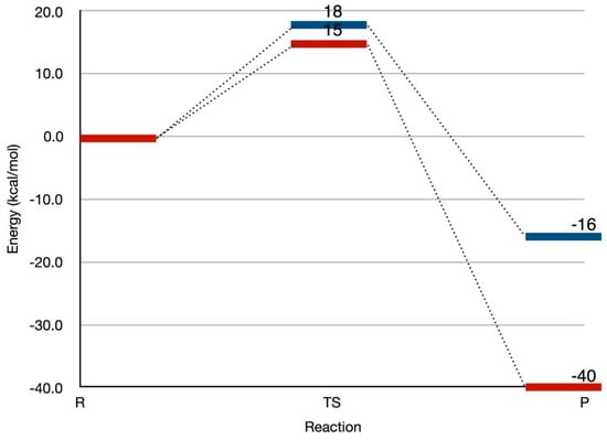 Haines et al. [] showed that two hydrogen bonds or a highly acidic group for proton transfer were necessary for the stabilization of the intermediate, although Oliveira et al. [] concluded that the reaction is highly asynchronous. The change in the atomic charge at Glu98’s carbon is minimal as it goes from 0.6033 in reactants to 0.6301 in both transition state and products. This would perhaps imply that the reaction proceeded in two steps rather than one. In the first step, NADPH donates a hydride to mevaldehyde, which then stabilizes its negative charge through proton exchange with Glu98 in the following step. A comparison of the energy profiles of the two hypotheses can be seen in Figure 5. In the end, the question that remains unsolved is whether -SCoA stays in the active site or leaves the active site before the proton exchange. This theory should be further tested as we observed two channels while looking at the surface of the HMG-CoA reductase, which suggests that the -SCoA could stay inside the active site. Presumably, it should not affect the reaction itself, as it is too far from the active site and the atoms involved in the reaction mechanism.