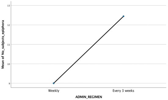 The mean number of subjects with epiphora in the two administration regimens (9 for weekly administration, 12.4 for every 3 weeks regimen).