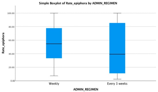 Rate of epiphora recorded in each administration regimen used, as median (54.64 for weekly regimen and 39.28 for every 3 weeks administration), maximum, and minimum values.