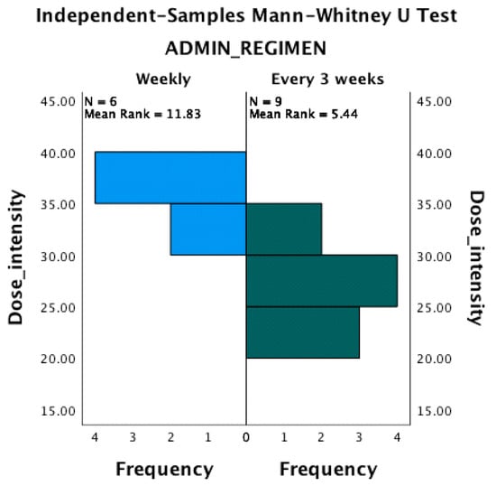 The mean dose intensity for patients treated by weekly administration was 33.36 mg/m2/week (SD = 2.53). The mean dose intensity for patients treated by every 3 weeks administration was 26.11 mg/m2/week (SD = 4.37). The difference between dose intensity for the therapeutic regimen is statistically significant (p < 0.0001), and there is a negative correlation between the dose intensity value and the number of weeks between doses. The median for dose intensity independent of the treatment regimen was 30 mg/m2/week, and the incidence of the epiphora was similar (not statistically significant different) for doses over and under this value (Figure 3 and Figure 4).