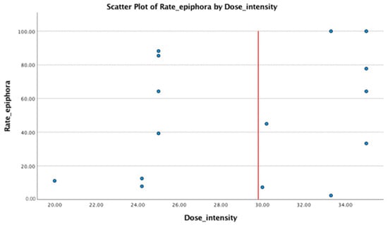 The distribution of rate of epiphora by dose intensity is approximately equal related to the red line. The red line represents the median value of the dose intensity (=30 mg/m2/week).