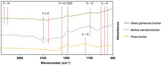 The spectra of Molinia cerulea and Elaeis guineensis show peaks at 2000 and 2100 cm−1, corresponding to triple bond of alkynes that are part of the lignocellulose [77,78,79]. Finally, only the biochar of Elaeis guineensis show the presence of asymmetric (2910 cm−1) and symmetric (2850 cm−1) C–H stretching bands associated with aliphatic functional groups, which decrease in intensity due to structural changes occurred during pyrolysis that produce a decrease in aliphatic compounds [80,81]. The spectra obtained from the biochar of Picea, Molinia caerule and Elaeis guineensis, don’t show high intensities due to the carbonization processes to which the biomass is subjected. In addition, the functional groups are related to lignocellulosic feedstocks such as those used in this work. Finally, it is suggested that the differences found in the spectra may be due to the conditions of the thermal conversion process of biochar, since many authors [21,82] report that variables such as reactor type, heating rate, temperature, residence time, oxygen concentration, etc. are significant variables that can affect the characteristics of biochar produced.
