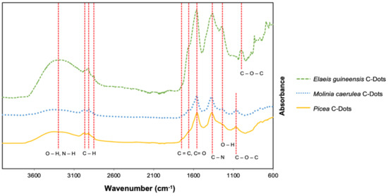 Finally, the peaks displayed between 2850 cm−1 and 2950 cm−1 are from C–H stretching vibration [91,92,93], and the broad absorption band within 3100–3600 cm−1 derives from the stretching vibration of hydroxyl bonds (O–H) and N–H [83,84]. This data suggest that the C-Dots obtained from Picea, Molinia caerulea and Elaeis guineensis present large hydrophilic groups indicating the formation of water-soluble materials, and the presence of carbonyl moieties suggest that the C-Dots could be slightly negatively charged.