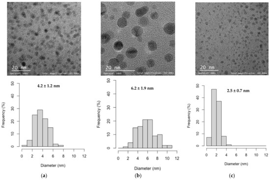 The HR-TEM and the DLS were utilized to investigate the morphology and average size of the biochar-derived C-Dots. The size distribution obtained by measuring the hydrodynamic diameter of C-Dots (1000 ppm) derived from Picea, Molinia caerulea and Elaeis guineensis; by DLS indicates that these nanoparticles have a total hydrodynamic diameter of 113 ± 13.4, 122.7 ± 2, and 105.4 ± 7.1 nm and the polydispersity index are 0.19 ± 0.01, 0.18 ± 0.04, and 0.2 ± 0.03, respectively. Besides, the DLS graphs show that the three types of C-Dots are bimodal and have a second population of particles with hydrodynamic diameter less than 5 nm. However, HR-TEM images (Figure 3) reveal that the three types of the extracted biochar nanoparticles (Picea, Molinia caerulea and Elaeis guineensis) are mono-dispersed, and they have a nearly spherical shape with an average size of 4.2 ± 1.2, 6.2 ± 1.9 and 2.5 ± 0.7 nm, respectively (Figure 3) (the size distribution was determined with 100 particles, which are founded in various TEM images related to different zones in the sample). Besides, the HR-TEM images show some aggregation between the particles, which explains the total hydrodynamic diameter measured with DLS. It is comparable to other reported works [94,95,96]. C-Dots derived from Elaeis guineensis biochar are smaller than the other particles and the C-Dots derived from Molinia caerulea biochar have the greatest variability in size. However, since all the particles are in the range less than 10 nm, they are considered C-Dots.