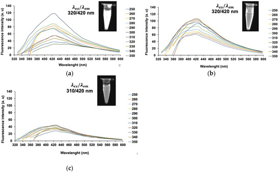 The fluorescence spectra (Figure 4) show the maximum emission wavelength (λem) at similar value: 430, 420, and 420 nm for Picea, Molinia caerulea and Elaeis guineensis, respectively. The maximum excitation wavelength is also similar, ranging from 300 nm to 320 nm. The optimal excitation and emission wavelength combination are shown as an insert of Figure 4. All the obtained C-Dots show a brownish yellow color under daylight, and blue emission under UV light.