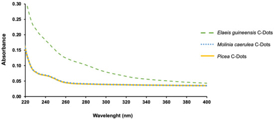 UV-Vis spectra of Picea, Molinia caerulea, and Elaeis guineensis C-Dots.