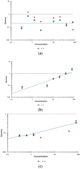 Aquatic toxicity test results for Picea (a), Molinia caerulea (b) and Elaeis guineensis (c). Gamma = 1 corresponds to the EC50. Horizontal axis corresponds to the percentage of the concentration, where 100% equals 1000 ppm.