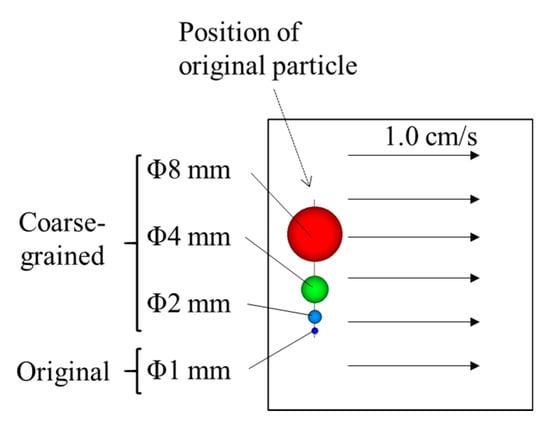 The original particle and three CG particles are positioned for their centers to be lined up on the same straight line. Table 1 shows the simulation conditions of the particles. The densities of the CG particles are calculated by Equation (7). The fluid density and viscosity are set to and s, respectively.