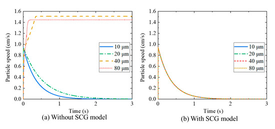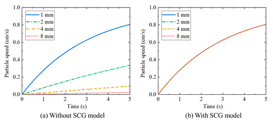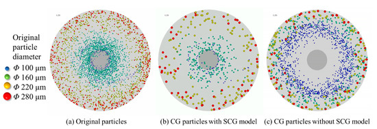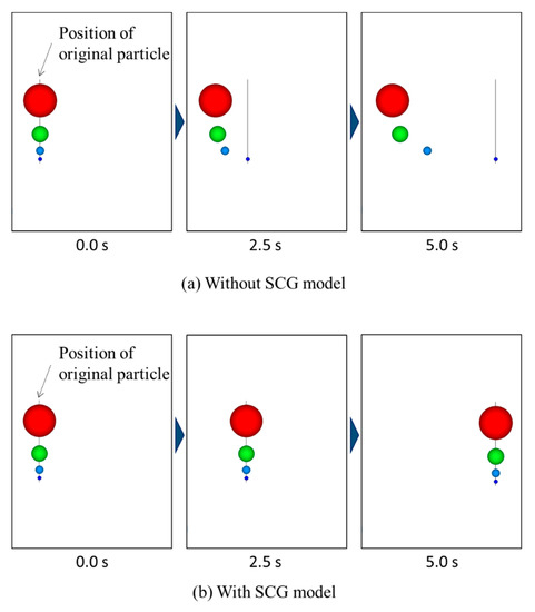 Figure 2 shows the snapshots of particle behaviors by the DEM with and without the SCG model. Further, Figure 3 shows the change of the particle speeds in time. In the case without the SCG model, the particles move faster with decreasing particle diameters, and the centers of the particles are far apart from each other. This is because the inertia of particles is proportional to the third power of the particle diameters, while the fluid drag force is to the second power. Alternatively, with the SCG model, all of the particles move at the same velocity. Thus, it is suggested that the inertia of the CG particles could be precisely represented by using the SCG model. In Appendix A, Figure A1 and Figure A2 show the particle behaviors and the particle speeds when the CG particle masses are set to the same as the original particle mass, respectively. It is found that the larger CG particles move faster due to overestimating the fluid drag force.