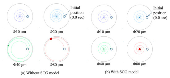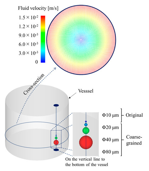 The centers of one original particle and three CG particles are placed on the straight line vertical to the vessel. Figure 4 also shows the vortex flow velocity field of the cross-section of the vessel. The field is created by superposing the forced-vortex field with the flow field toward the vessel’s center. In this case, the rotational speed of the forced-vortex is set to 300 rpm, and the speed of the field toward the center is set to 10 % of the flow velocity in the forced-vortex field. There is no velocity distribution in the vertical direction of the vessel. Table 2 shows the simulation conditions of the particles. The fluid density and viscosity are set to and s, respectively. The densities of the CG particles are calculated by Equation (7) in the same manner as Table 1. Figure 5 shows the particle trajectories in the vortex flow field represented by the DEM with and without the SCG model. Further, Figure 6 shows the change of particle speeds in time.