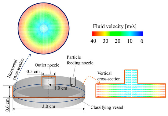 The behaviors of a number of CG particles in a classifier are compared with the behaviors of original particles to confirm the usability of the SCG model for representing the particle behavior as closely as possible to the real dilute systems. Figure 7 shows the geometry of the classifier and fluid velocity field in the classifier. The CG and the original particles are fed from the upper wall of the classifying vessel, and the 7.0 m/s feeding velocity is given to all of the particles. The flow field is created by superposing the forced-vortex field with the flow field toward the classifying vessel’s center. In this case, the rotational speed of the forced-vortex is set to 5000 rpm, and the speed of the field toward the center is set to five times of the flow velocity in the forced-vortex field. Further, the 1.0 m/s constant vertical flow velocity is set where the radial distance from the center is below the outlet nozzle radius, and the classified smaller particles are drained from the outlet nozzle.