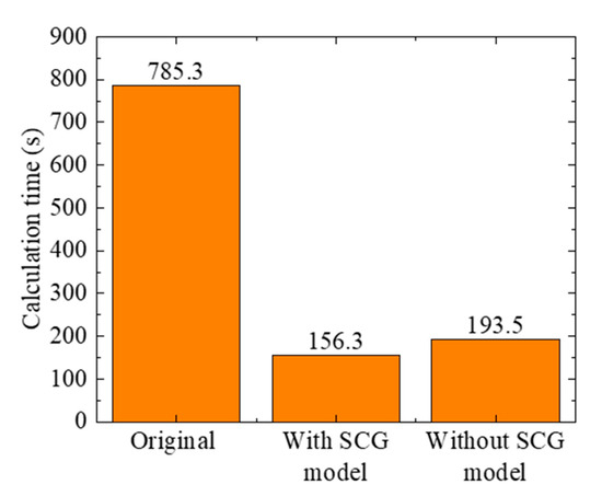 Comparison of calculation time for representing the behaviors of the original particles and the CG particles with and without the SCG model for 0.1 s.
