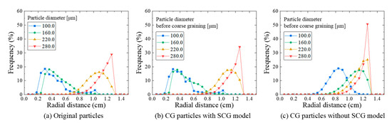 Figure 9 shows three patterns of particle behaviors in the classifier after 0.25 s passed: the original particle behavior and the CG particle behaviors with the SCG model and without the SCG model. The motions of the original particles are different depending on each particle diameter; the particles’ existing radial distances increase with the increase of the particle diameter due to the centrifugal forces being strengthened. Additionally, a part of the smaller particles (100.0 and 160.0 mm) is drained from the outlet nozzle. The CG particle motions with the SCG model are similar to the original particles. However, the CG particles without the SCG model revolve at the places of the longer radial distances than the original particles and the particles are rarely drained from the outlet nozzle. To confirm the similarity in particle behavior, radial distance distributions are calculated. Figure 10 shows the radial distance distributions for each particle diameter of the original particles and the CG particles with the SCG model and without the SCG model. The distributions are cumulated for 0.1 s after 0.2 s passed. The radial distance distributions of the original particles are roughly separated by the particle diameters: the smaller particles (100.0 and 160.0 mm) revolve at the place of the shorter radial distance, while the larger particles (220.0 and 280.0 mm) revolve at the place of the longer radial distance. Namely, the original particles are classified by the classification effect, and the classifying particle diameter of the original particles is between 160.0 and 220.0 mm. The radial distance distributions of the CG particles with the SCG model are similar to those of the original particles for all particle diameters, while those of the CG particles without the SCG model differ from the original particles. This indicates that the SCG model can analyze the classification effect and the motion of the particles in the classifier, and that the SCG model could be applied to simulate a real dilute system that has a number of particles and different particle diameters. Moreover, the Stokes number is approximately 10–100 in the simulation conditions of this section. It is suggested that the SCG model can be applied even though particle collisions occasionally occurred.