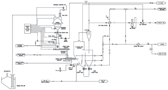The in-vessel gas filtration system was implemented to a bubbling fluidized bed reactor, part of a pre-existing gasification plant designed for continuous operation. In this plant, the biomass is fed in “in-bed” mode in order to have a better mixing of bed material and supplied fuel, while the gasifying agents (steam and oxygen/enriched air) are fed from the bottom of the reactor to ensure proper bed fluidization. Drawings of the pre-existing plant and of the gasification reactor in the upgraded configuration are presented in Figure 1 and Figure 2, respectively. The details of the plant have been described in a previous work [27].