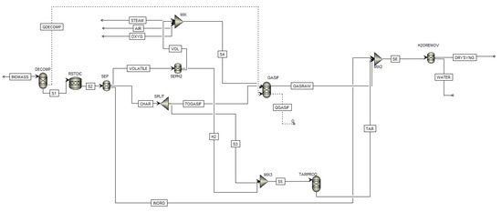 The gasifier model is based on Gibbs free energy minimisation through the quasi-equilibrium approach and has been developed and validated by Aspen Plus software in two previous works by the authors [29,30]. In Figure 3, the model flow sheet is shown. After defining the non-conventional component biomass based on the proximate and ultimate analysis (refer to Table 1), a RYIELD reactor DECOMP was used to convert biomass in conventional components (e.g., C, O2, H2, N2, Cl, S, according to the ultimate analysis). Since the repartition of the products (gas, tar, and contaminants) is unknown, a DECOMP was considered more suitable than a RYIELD, fixing the products based on specific experimental conditions. Products exiting the DECOMP block were moved to the RSTOIC block to simulate the production of H2S, HCl, and NH3 (N2, Cl, and S as elemental components are known to produce mainly H2S, HCl, and NH3, and a fractional conversion of 1 is quite in line with experimental data which represents the worst case of maximum contaminants) [30]. Deriving stream S2 was moved to a separator SEP which separates the stream into three sub-streams: volatile part VOLATILE, char part CHAR, and a stream composed of inorganic contaminants (HCl and H2S) called INORG. Then, VOLATILE stream was divided into two sub-streams: VOL and H2. The former, after mixing with the oxidizing fluid, went into the gasifier, GASIF, and the latter was used to simulate tar production in the RYield block TARPROD where tar is considered to be formed, using experimental data of 18 g/Nm3 [30]. The considered tar amount was repartitioned into 60% benzene, which does not condense (so it is not a “real” tar) but it is the most present hydrocarbon in biomass gasification after methane, 20% toluene (as representative of the fast tar) and 20% naphthalene (as representative of the slow tar) [30]. The gasifier, considered as an autothermal fluidized-bed reactor, was modelled by a RGibbs reactor (GASIF in Figure 3) and the bed material was sand. Within the reactor, the restricted chemical equilibrium of the specified reactions was simulated in order to set the product gas composition by specifying a temperature approach for each individual reaction. In Figure 3, the stream’s steam (STEAM), oxygen (OXYG), and air (AIR) are all shown since the model is able to work with all the combination of oxidizing agents. The mass flow of the stream that was not used was set to zero. The stream S6 represents the global wet output of the gasifier, which is in fact made by the union of GASRAW, INORG, and TAR streams. The block H2OREMOV represents a dryer that removes all the water, so the stream DRYSYNG is the dry output of the gasifier.