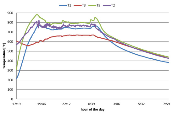 After the start-up phase, the process at each test sets and the plant achieved a stationary condition characterized by stable temperatures and gas composition. In Figure 4, as an example, the trend over time of the temperatures at the four measurement points when operating the gasifier at a high biomass feeding rate is shown. The stable operating period in which the bed inventory temperatures swing in the range of 780–850 °C is recognizable. The temperatures indicated by T3 are lower since the related thermocouple was located in the upper part of the reactor. The highest temperature, T9, is detected at the middle of the bed where an intimate mixing of biomass feedstock, sand, and gasifying agents was realized. The values indicated by T1 are reasonably lower that T9 and T2. In fact, T1 is positioned at the lower part of the fluidized bed, where gasifying agents at relatively cold temperature (350–400 °C) were addressed through the bottom of the reactor.