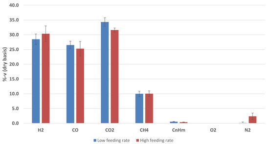Average compositions of the producer gas obtained in the gasification tests at low and high biomass feeding rates. Percentages by volume, referred to dry gas.
