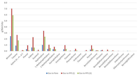 Comparing the tar content in the producer gas obtained in the three samplings, at first glance the figures seem to show a rather significant differences in terms of both gravimetric and chromatographic data. These differences can however be justified by the temperature values reached in the gasifier during the respective tar sampling. Specifically, the gasifier was in fact operating at a temperature around 830–840 °C during the gas sampling on the stream to the flare, at around 800–820 °C and 840–850 °C during the two gas samplings carried out on the stream addressed to the portable purification station, PPS (I) and PPS (II), respectively. Thus, the tar values from flare and PPS (II) are similar to each other, and have a lower content with respect to PPS (I). Since these values come from a plant of significant size, it is not the difference in values that is relevant, but rather the fact that overall the tar content was at most a few tens of grams per unit of dry gas (i.e., around 20 g/Nm3dry). Such value can therefore be considered as the one representative of the gasifier performance under the considered operating conditions.