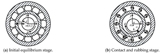 2.2. Impact-Rubbing Dynamics Model of the “Rotor-Deep Groove Ball Bearing”