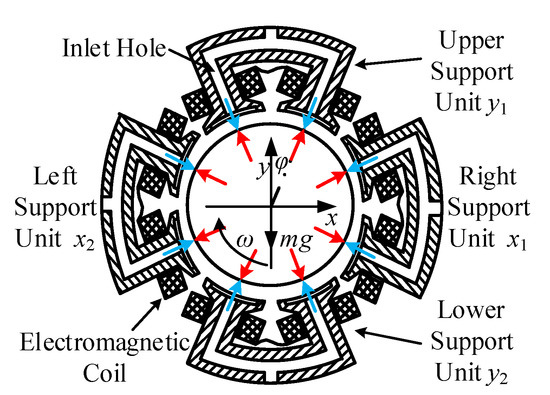 - Zhao, J.; Chen, H.T.; Wang, Q.; Zhang, B.; Gao, D.R. Stability Analysis of Single DOF Support System of Magnetic-Liquid Double Suspension Bearing. Hydromechatron. Eng. 2019, 47, 1–7. [Google Scholar]