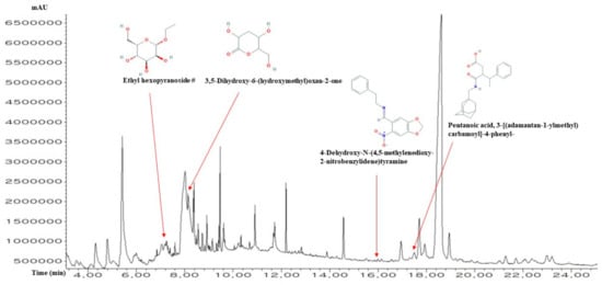 Additionally, toxicological properties of ethyl- α-d-glucopyranoside; 3,5-dihydroxy-6-(hydroxymethyl)oxan-2-one; 4-dehydroxy-N-(4,5-methylenedioxy-2-nitrobenzylidene)tyramine; and pentanoic acid, 3-[(adamantan-1-ylmethyl)carbamoyl]-4-phenyl- were predicted by admetSAR online tool. Our result suggested that the bioactives did not relate to Ames toxicity, carcinogenic properties, acute oral toxicity, and rat acute toxicity properties (Table 9).