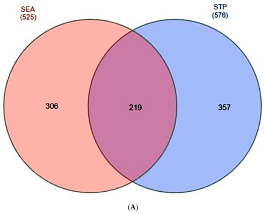 A total of 525 target proteins from SEA and 576 target proteins from STP connected to 51 chemical compounds were identified (Supplementary Table S1). The Venn diagram showed that 219 target proteins were overlapped between the two compound databases (Supplementary Table S1) (Figure 3A).