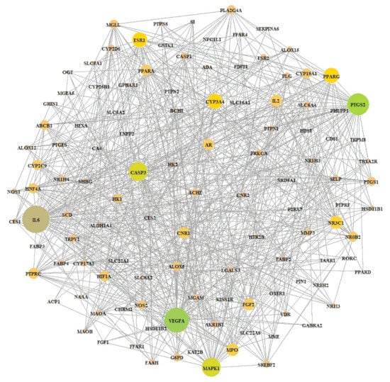 Network pharmacology is an efficient method to comprehend relationships between multiple unspecific compounds and multiple target proteins []. It is a relatively effective technique to analyze herbal medicines regarding novel active compounds and new mechanisms of action against different diseases []. Mainly, for metabolic syndrome research, the network pharmacology approach contributes to unravelling complex biological systems and interactions between active compounds and target proteins [,].