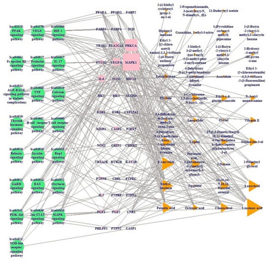 The signaling pathways-target proteins-chemical compounds (STC) network was utilized to construct a size map, based on the degree of values. In the network, green circles (nodes) represented signaling pathways; pink rectangles (nodes) represented target proteins, and orange triangles (nodes) represented chemical compounds. The size of the pink rectangles stood for the number of connectivity with signaling pathways; the size of the orange triangles stood for the number of connectivity with target proteins. The merged networks were constructed using RPackage.