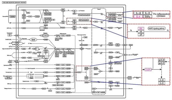 NOD-like receptor signaling pathway. Red dotted line indicated IL6; MAPK1 (known as ERK); and CASP1 location. Pink colors represent target proteins of ICLs on obesity.