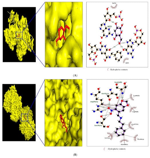 The ligand molecules were docked with target proteins utilizing autodock4 by setting-up 4 energy range and 8 exhaustiveness as default to obtain 10 different poses of ligand molecules []. The active site’s grid box size was x = 40 Å, y = 40Å, and z = 40Å. The 2D binding interactions were used with LigPlot+ v.2.2 (https://www.ebi.ac.uk/thornton-srv/software/LigPlus/) (accessed on 14 May 2021) []. After docking, ligands of the lowest binding energy (highest affinity) were selected to visualize the ligand-protein interaction in Pymol.