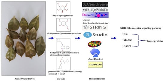 In conclusion, we firstly analyzed the ‘multi-signaling pathways—multi-target proteins—multi-compounds’ network of ICLs against obesity via MDT. As a result, we found a key signaling pathway (NLR signaling pathway), three target proteins (IL6, MAPK1, and CASP1), and four compounds (ethyl-α-d-glucopyranoside; 3, 5-dihydroxy-6-(hydroxymethyl)oxan-2-one; 4-dehydroxy-N-(4,5-methylenedioxy-2 nitrobenzylidene) tyramine; and pentanoic acid, 3-[(adamantan-1-ylmethyl)carbamoyl]-4-phenyl-). Furthermore, the potential four compounds from ICLs have better affinity on each target protein than positive controls, suggesting that the compounds might be a new agent against obesity. Therefore, our research approach would be valuable for facilitating studies of herbal plants against obesity through network pharmacology.