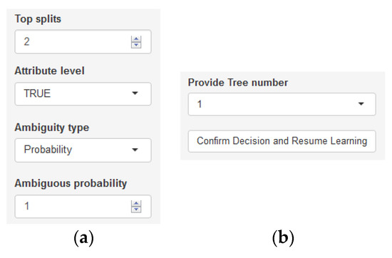 We then moved to an example incorporating ambiguity to the learning, which was defined by the difference in the probabilities between the highest class probability and the second-highest class probability per node, below which the expert had to make a decision regarding the subsequent tree structure. We set up this threshold at 0.40 (the ambProb parameter in console mode or “Ambiguous probability” in Shiny). The remaining parameters stayed the same. After starting the learning, the first step generated the results presented in Figure 5a.