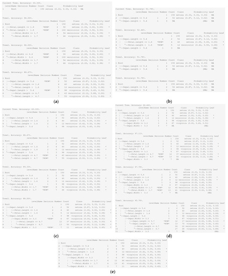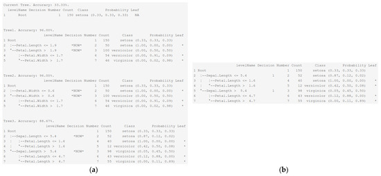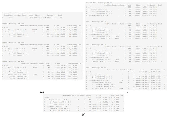After moving to the right side of the structure (third node) and updating the information for the node, the tree being generated had an accuracy of 63.33%, which can be seen in Figure 3c. First, two possible splits generated only one division, while the third one split the considered node and then later, the left child was also partitioned using the “Petal.Length” attribute. Interestingly, the local best partition (splits are sorted by gain ratio) did not indicate the best global accuracy. The first tree had the best gain ratio with a global accuracy of 88.67%; however, the second-best local split in terms of the gain ratio had a bigger overall accuracy of 89.33%. Let us assume that this time, the user selected the third split.