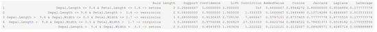 After the decision, it turned out that interactive learning was over, leading to the structure presented in Figure 3e. After updating the information regarding node number 7, the overall accuracy of the final tree was 88.67%. The final tree structure had three intermediate and five terminal nodes. Based on this structure, the ExtractRules() function generated decision rules (in the form of a table), along with the corresponding measures, which are presented in Figure 4. Each rule was of the form “conjunction of some conditions class label”. Next, on the right, there are accuracy measures, such as: length of the rule, Support, Confidence or Lift.