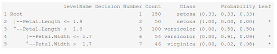 As presented in Figure 7, predicting Setosa is very easy; therefore, we proposed the following adjustment using a misclassification cost matrix: versicolor had a cost of 5 for virginica, while virginica had a cost of 10 for versicolor. As a result, the overall accuracy improved to 95.33% and the AUC reached 96.54%. The tree structure that was the result of interactive learning with the cost matrix is presented in Figure 8.
