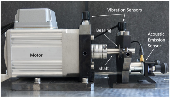 For vibration measurements, the setup is instrumented with ICP accelerometers (PCB 607A11, 100 mV/g, 0.5 Hz–10,000 Hz) at the bearing holder frame of the motor and the bearing holder frame of the shaft. Both vibration sensors are digitized by a DT 9837A USB-DAQ from Measurement Computing GmbH. This 4-channel signal analyzer is equipped with a 24-bit ADC, which supports sample rates of up to 100 kSPS and is well suited for the vibration measurements. AE signals were acquired by a piezo transducer (Vallen VS30V, 20 kHz–80 kHz) connected to an AEP5 preamplifier for signal conditioning. These signals were digitized with an USB oscilloscope (PicoScope 2204A: 2-channel, 8-bit ADC, sample rate up to 100 MSPS, analog bandwidth of 10 MHz). Both sensors were connected to a single board computer (Raspberry Pi 3B+) running custom software to acquire both data streams simultaneously. Data were stored in two separate files. However, all data could be synchronized afterwards by frequently incorporating precise time-stamps into the files. This synchronization was carried out using the system clock of the single board computer and thus did not include USB-related delays. Therefore, the overall synchronization performance was estimated to be ±10 ms.